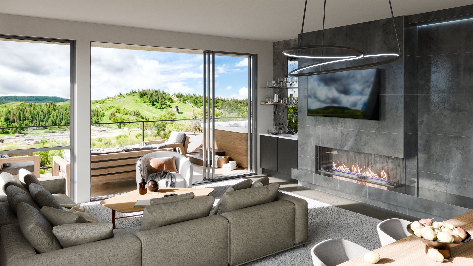 The penthouse occupies the southern side of the building, with views spanning from Steamboat Resort to the Yampa River. Multiple private decks and a rooftop terrace with 360-degree views give the residence an outdoor living program that's genuinely unusual for a downtown address.