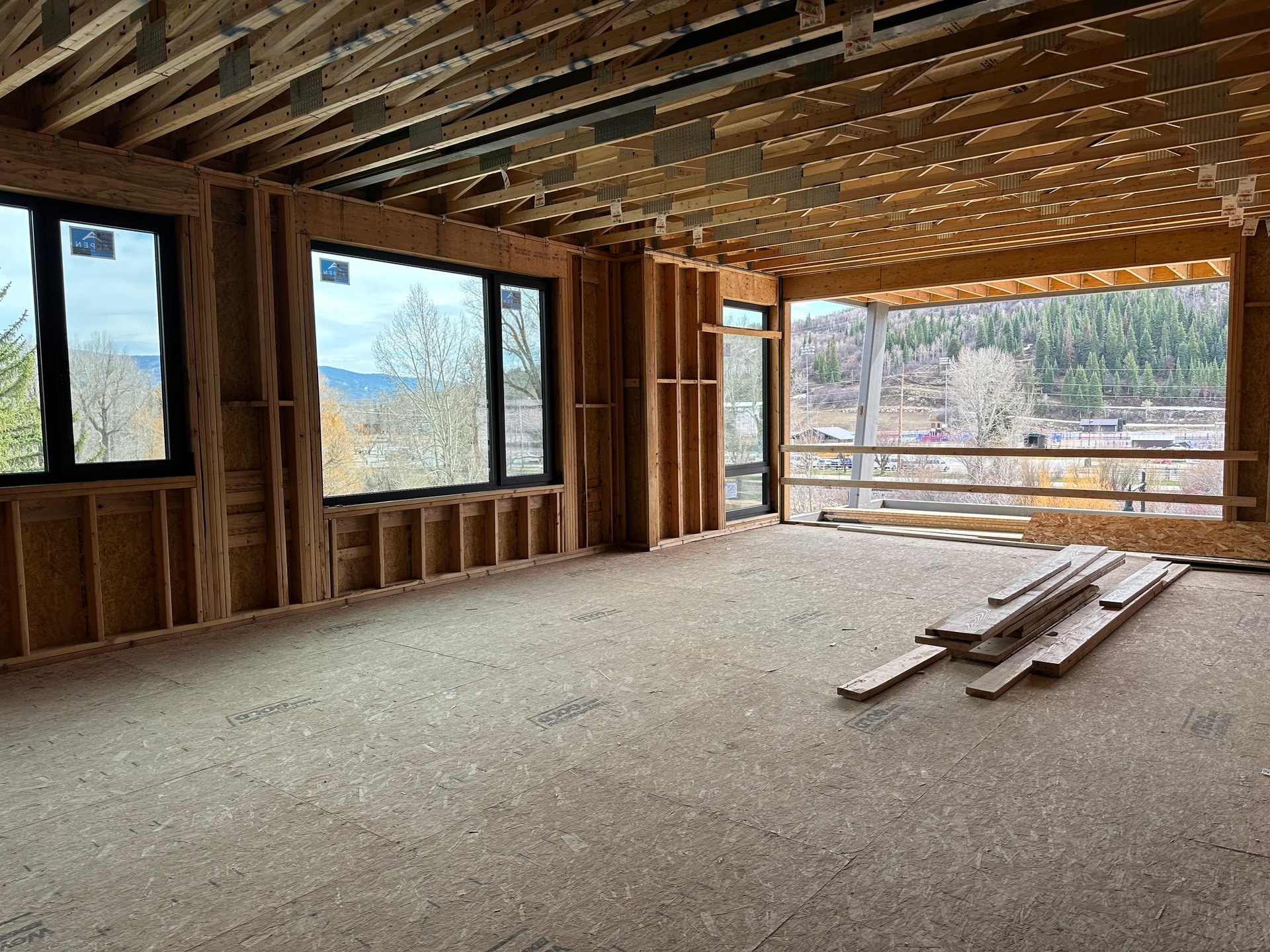 The expansive kitchen and living areas are fully framed, with massive window walls bringing in both light and the views the building's siting was designed to capture: the Yampa River, Emerald Mountain, and the Steamboat Ski Area to the south.