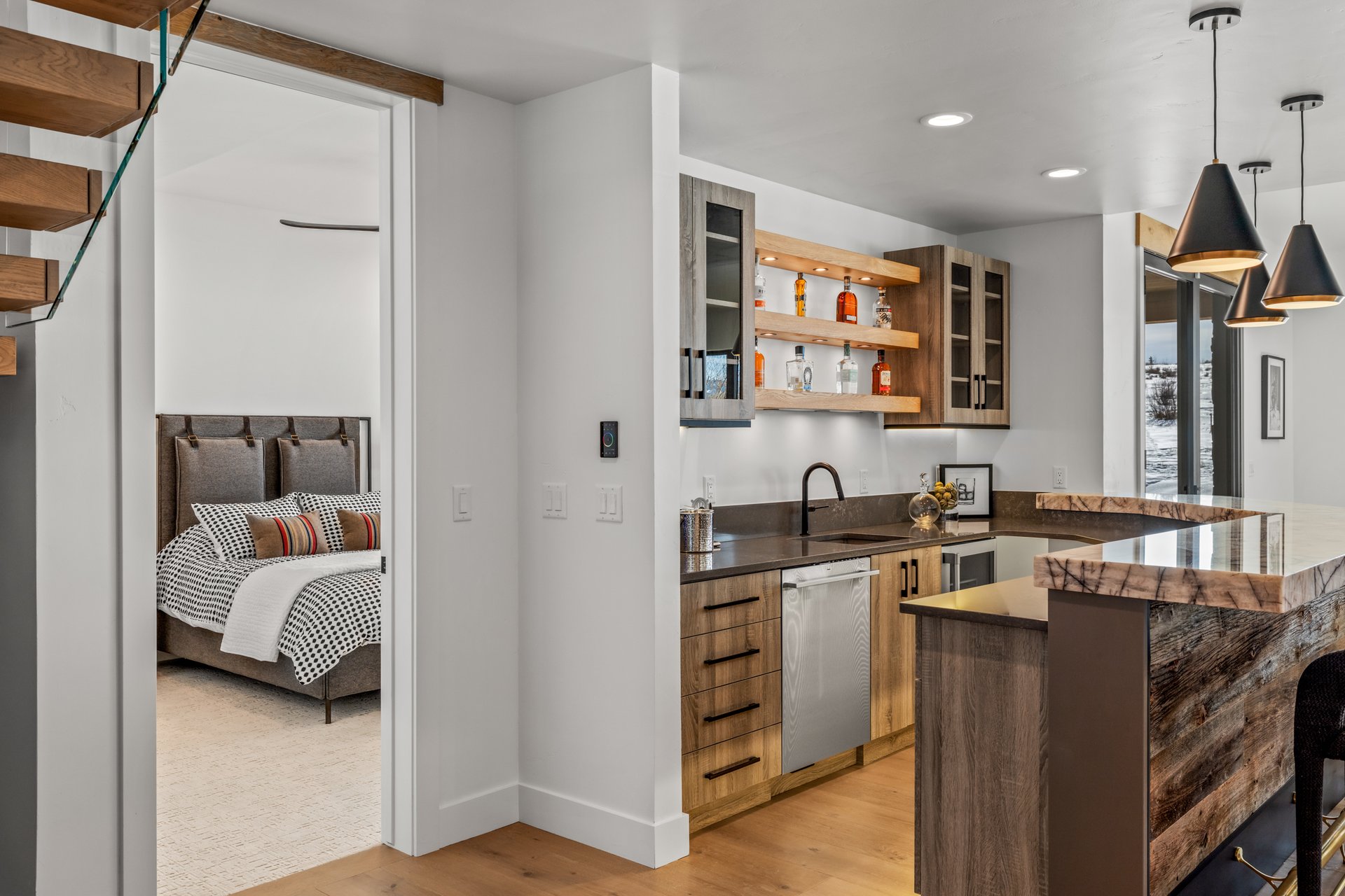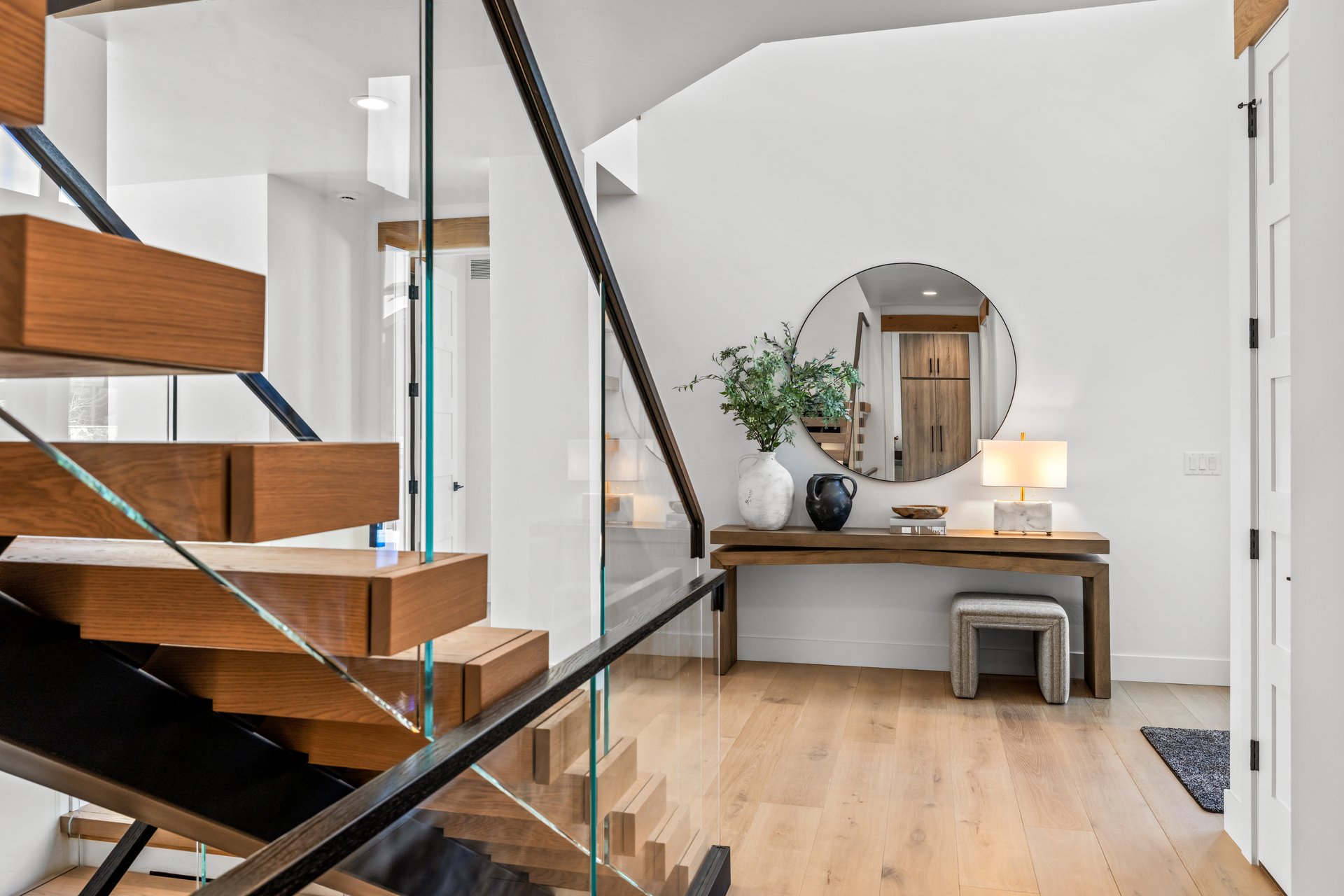 The entry sequence establishes the home’s vertical presence immediately. A double-height entry draws light deep into the interior, with soaring windows above the front door framing sky and landscape. The floating wood-and-glass stair becomes a defining architectural element, connecting levels while maintaining openness.