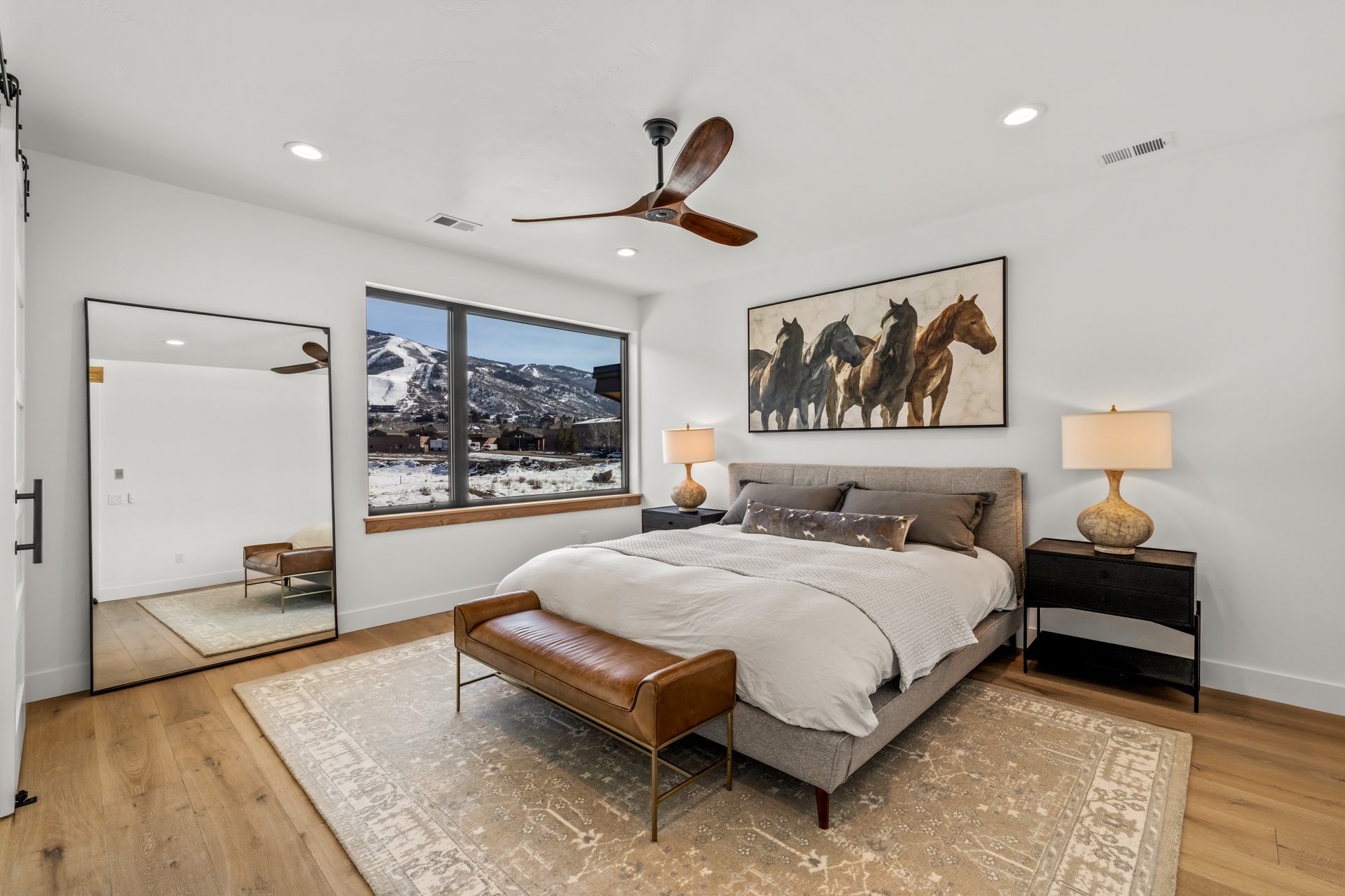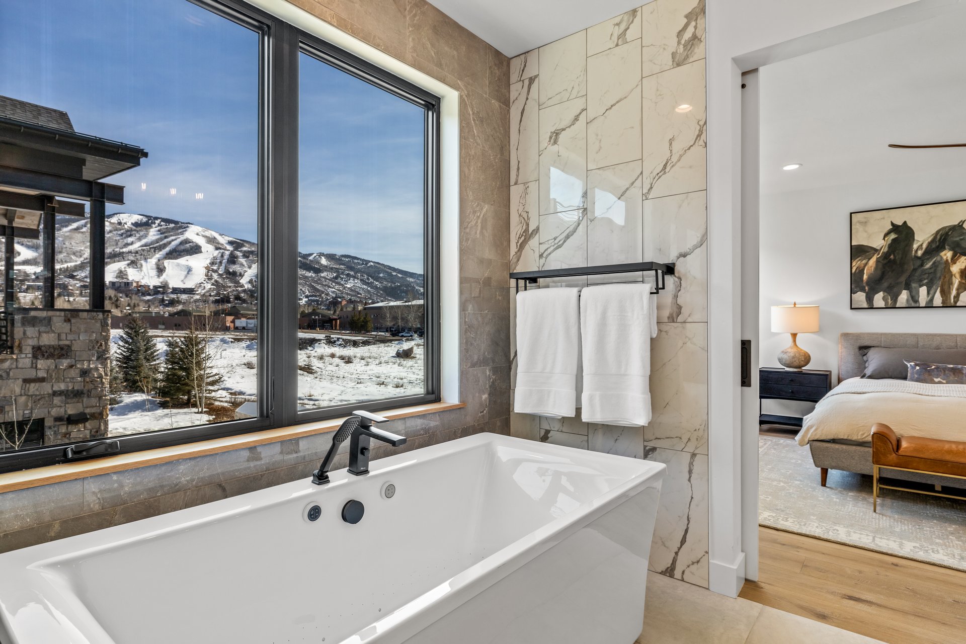 Private spaces continue the same level of finish and attention. The primary suite is oriented toward direct views of the Steamboat Ski Area, with a sliding barn door opening to a spa-like bath featuring a deep soaking tub, walk-in shower, radiant heated floors, and refined fixtures.