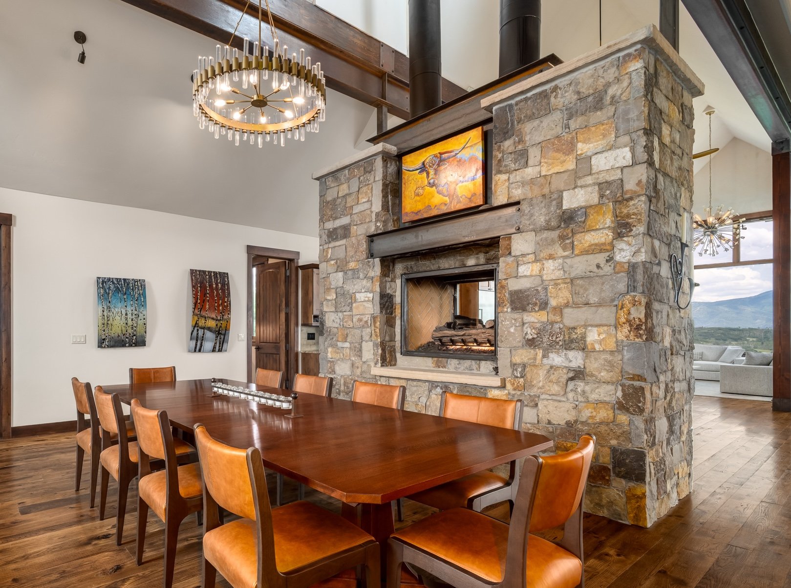 Inspired by the great lodges of Glacier National Park, Last Run Ranch features a towering fireplace where natural stone and steel create an industrial-meets-mountain centerpiece that spans floor to ceiling and functions as a striking see-through divider within the main living space. The great room’s soaring 23-foot ceilings and panoramic views of the ski area and South Valley give the space a sense of volume, while the fireplace adds weight and warmth. Outside, the experience continues with a stone fireplace and fire pit positioned to take in sweeping views across the estate, set on 36 acres just ten miles from Steamboat, accessible by all paved roads. Represented by Chris Paoli. View Listing →