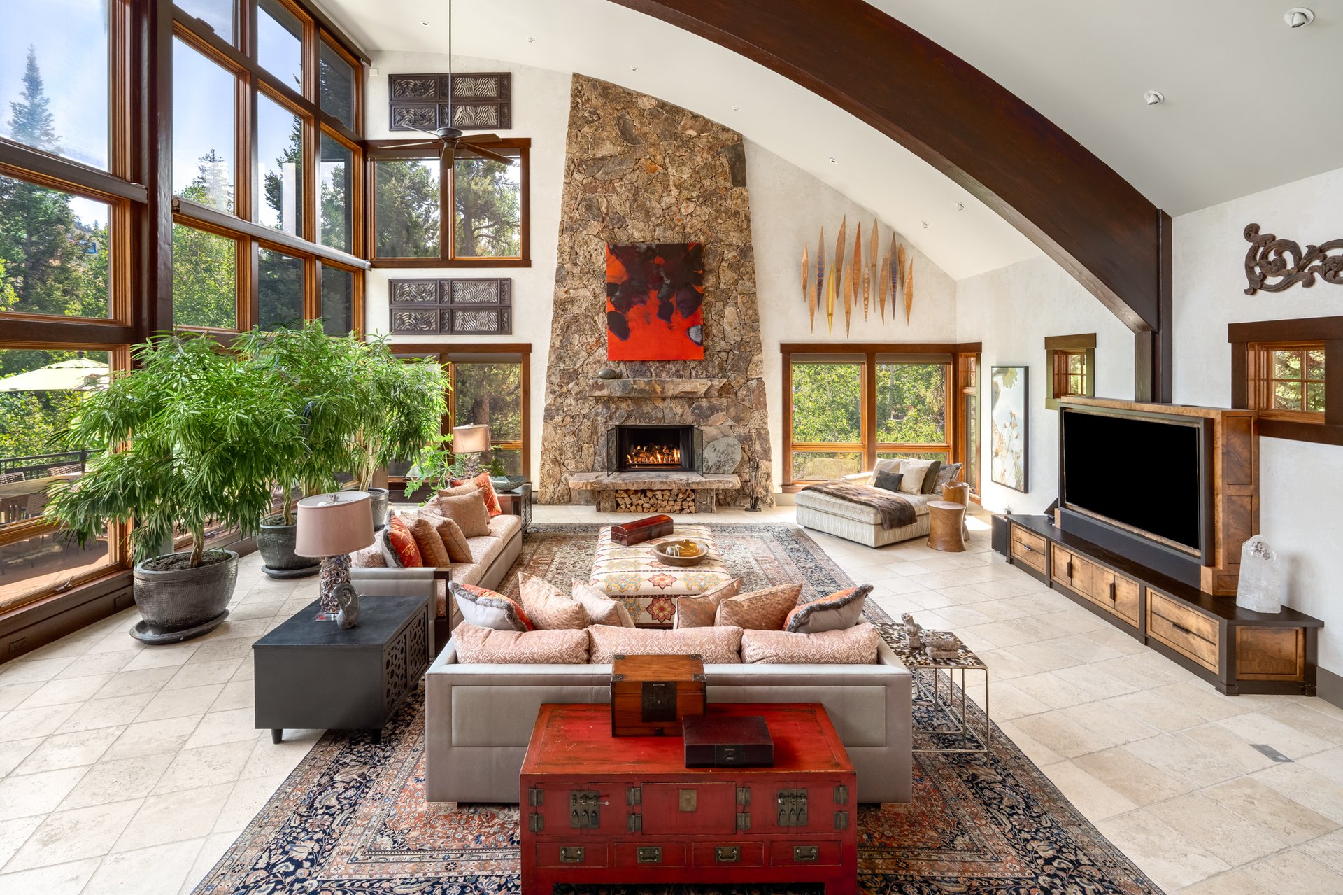 We used a neutral travertine throughout the whole home, floors, and walls, which was a new material for this area at the time. Most people in Steamboat were still using slate. By committing to it as a through-line, even the most traditional room in the house still feels connected to everything else.