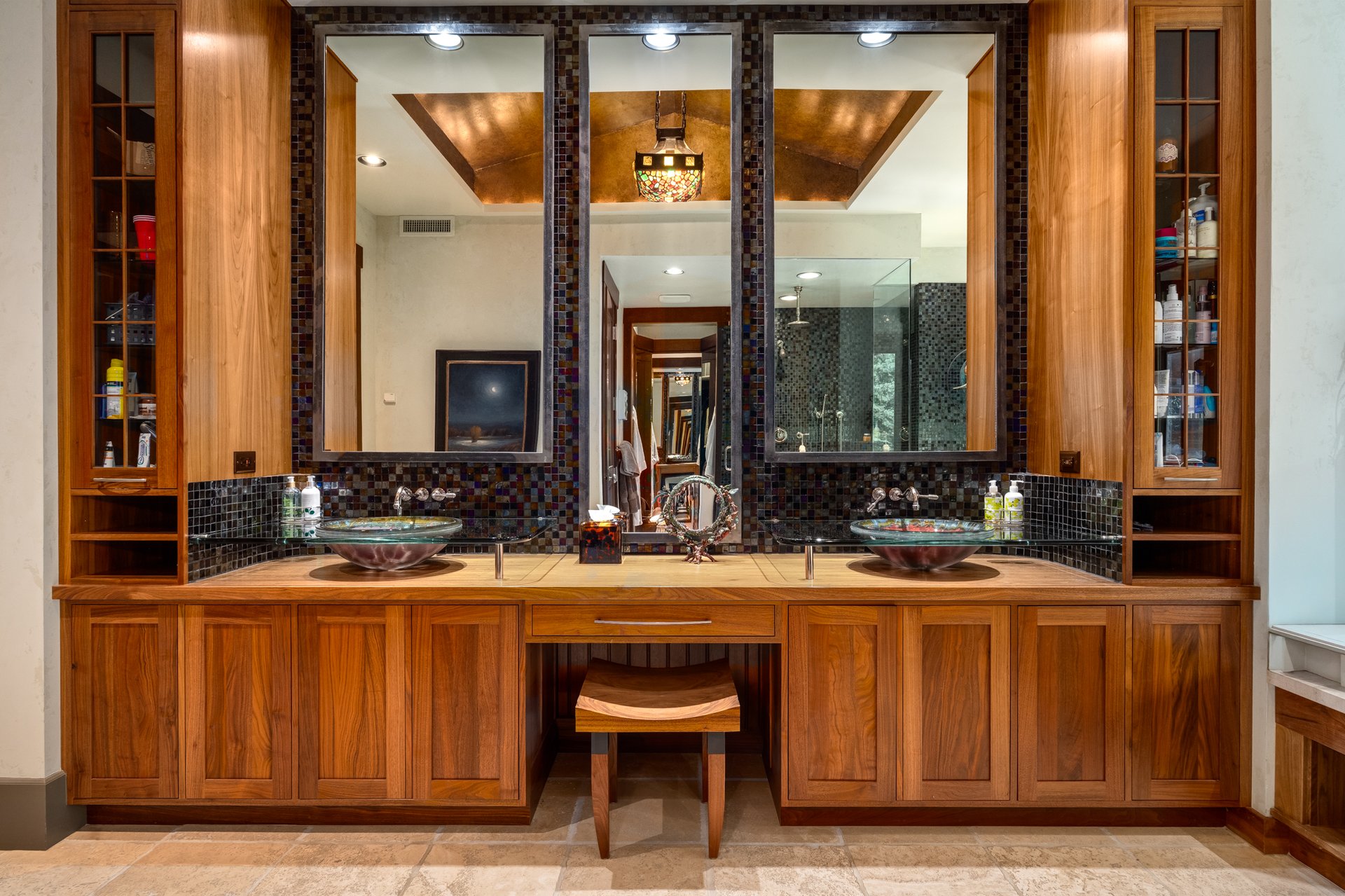 We also had metal bands built on-site by a welder in the powder room floor and framing the mirror. Those details are the kind of thing you don't notice consciously but feel right when you're in the space.