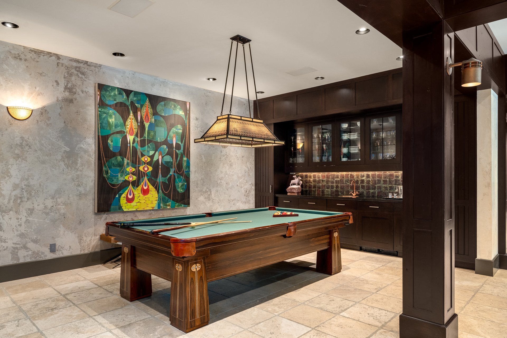 The consolidation. The owners sold two homes in New Jersey over the years—one at the shore, one in Short Hills—and when they did, we took the very best of everything and brought it here. The light fixtures over the kitchen island were in a New Jersey house. The rugs. A Steinway grand—an antique from a New Jersey house, which replaced a newer one that was here. A custom billiards room light fixture I designed for their New Jersey home came here. The Pucci dining table. Italian glass fixtures over the table. Textiles I designed that we used in the primary bedroom—they completely changed the character of that room.