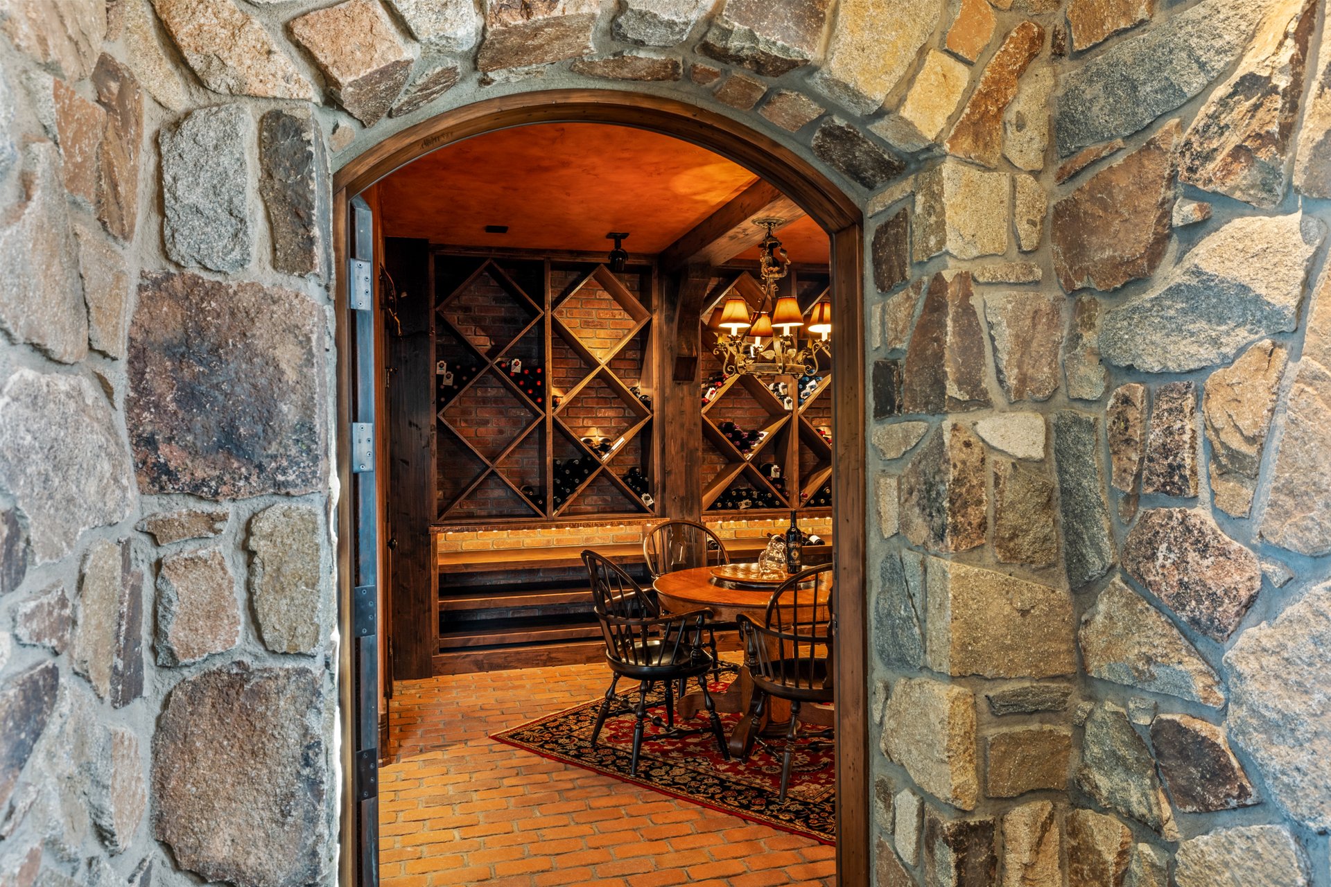 The ground floor of the estate is designed as a destination in its own right. A stone wall and bridge pass over a cascading water feature, leading to an exquisite wine cellar and tasting room. Brick walls and floors, custom cabinetry, and a distinctive copper-plated door create a space that feels both Old World and deeply personal. A wet bar anchors the tasting area, inviting long evenings and quiet gatherings.
